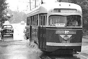 1942 PCC 2632 splashes through high water on Chester Avenue in